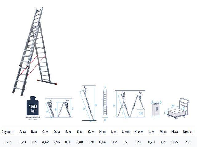 Лестница алюм. 3-х секц. 309/796/328см 3х12 ступ., 23,5кг NV5230 Новая Высота (макс. нагрузка 150кг)