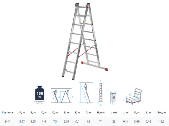 Лестница алюм. 2-х секц. 355/605/367см 2х14 ступ., 16,2кг NV323 Новая Высота (макс. нагрузка 150кг)