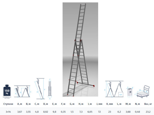 Лестница алюм. 3-х секц. 355/892/367см 3х14 ступ., 23,2кг NV323 Новая Высота (макс. нагрузка 150кг)