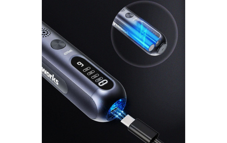 Гравер имеет встроенный аккумулятор, который обеспечивает до 40 минут работы без подзарядки. Индикатор заряда показывается на дисплее. Батарея заряжается за час с помощью USB-C кабеля.