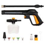 • Усиленный пеногенератор из износостойкого пластика позволяет точно настраивать интенсивность пены и получать густую пенную смесь для различных задач очистки.
