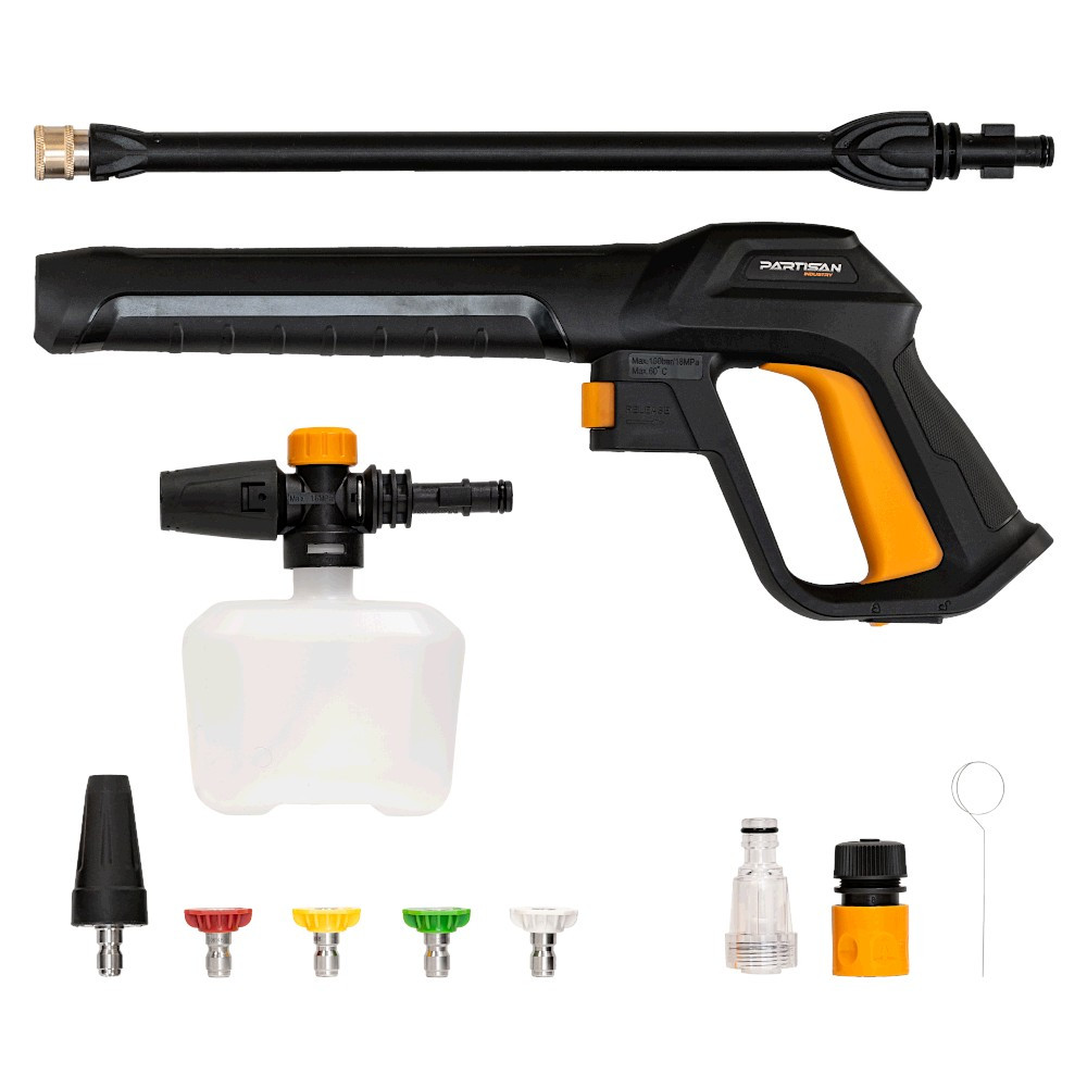 • набор аксессуаров для комфортного использования (держатель пистолета, держатель шнура питания, держатель форсунок, фильтр подачи воды, игла для очистки форсунки, винты)
