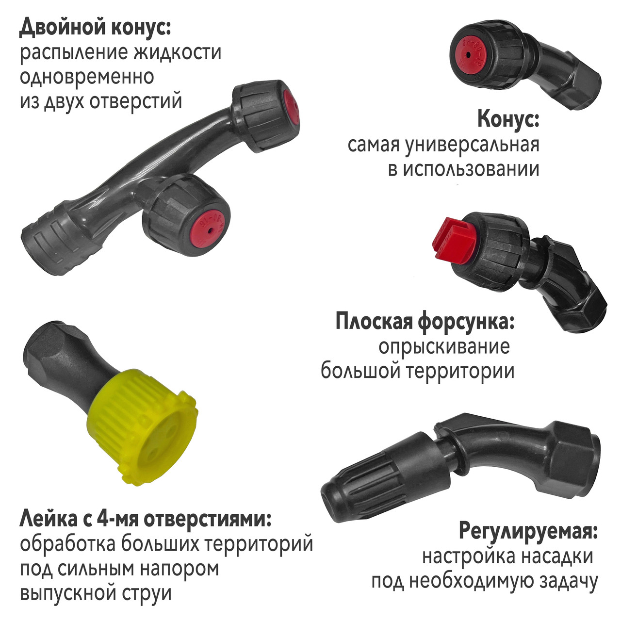 Благодаря продуманной эргономике, устройство легко носить на спине, как ранец. Опрыскиватель оснащен широкими наплечными лямками и поясным ремнем, которые надежно фиксируют устройство. Модель имеет небольшой вес, низкий уровень шума и вибрации по сравнению с бензиновыми аналогами. В комплект входят 5 насадок для разного вида распылений.