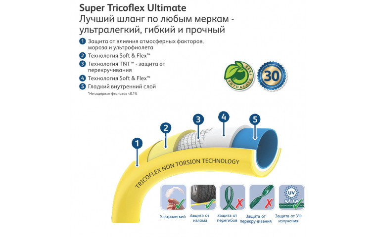 Шланг с гладкой поверхностью, для производства используется самая продвинутая система армирования на планете. Состоит из 5-ти слоев. Гладкий внутренний слой обеспечивает максимальный ток воды. Однородный микропористый слой из ПВХ по технологии Soft&Flex действует как амортизатор, обеспечивая превосходную резистентность к перекручиванию с сохранением легкости и подвижности, что позволяет шлангу легко маневрировать по участку. Без усилий сматывается в катушки и системы хранения. Специальное армированное плетение по технологии TNT предотвращает деформацию шланга при скручивании; внешний слой из ПВХ защищает от повреждений. Яркий желтый цвет позволяет Вам без труда увидеть шланг на любой поверхности. Материалы, из которых состоит шланг, являются безопасными для человека и окружающей среды — не содержат фталатов, тяжелых металлов и вредных токсинов.