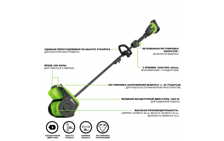 Удобная переставляемая по высоте рукоятка делает управление инструментом комфортным и оптимальным для любого роста. Мощный бесщеточный двигатель 1400 Вт — это надежная и эффективная работа даже при плотном снеге. Высокая производительность благодаря ширине захвата 30 см, высоте захвата 20 см.
