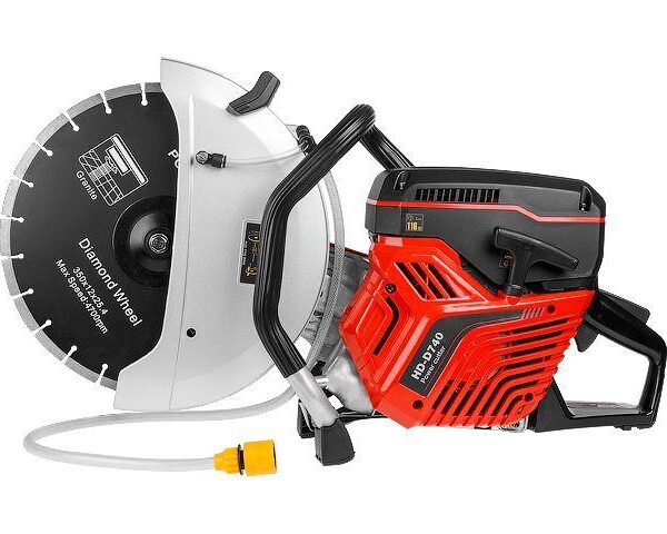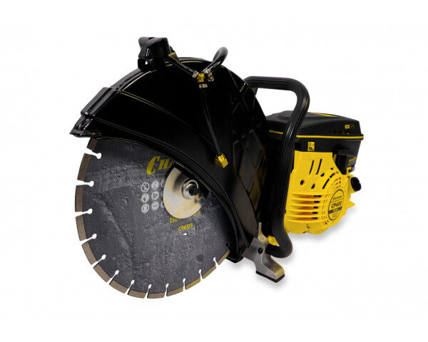 Мобильный бензорез с мощным двигателем в 4 кВт. Установленные колесики облегчают передвижение инструмента и нивелируют его вес. Предусмотрено водяное охлаждение диска.