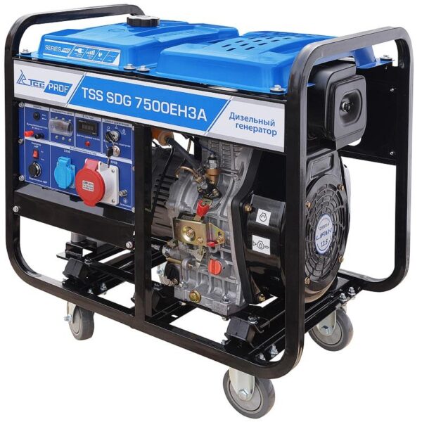 Дизель генератор TSS SDG 14000EH3A предназначен для выработки электроэнергии с основными характеристиками: напряжение 230-400 вольт, частота 50 Гц и номинальной мощностью 12 кВт, оснащенный колесным комплектом для удобства передвижения.